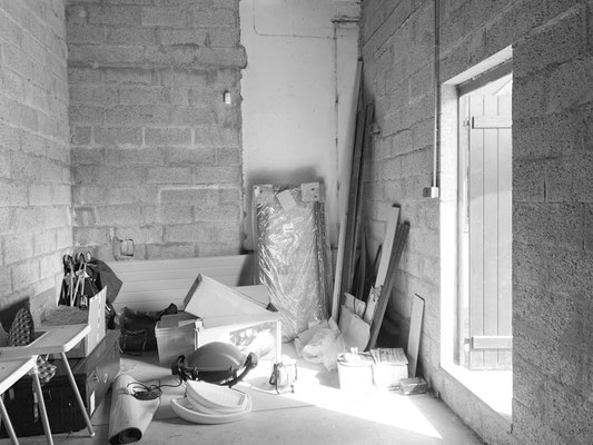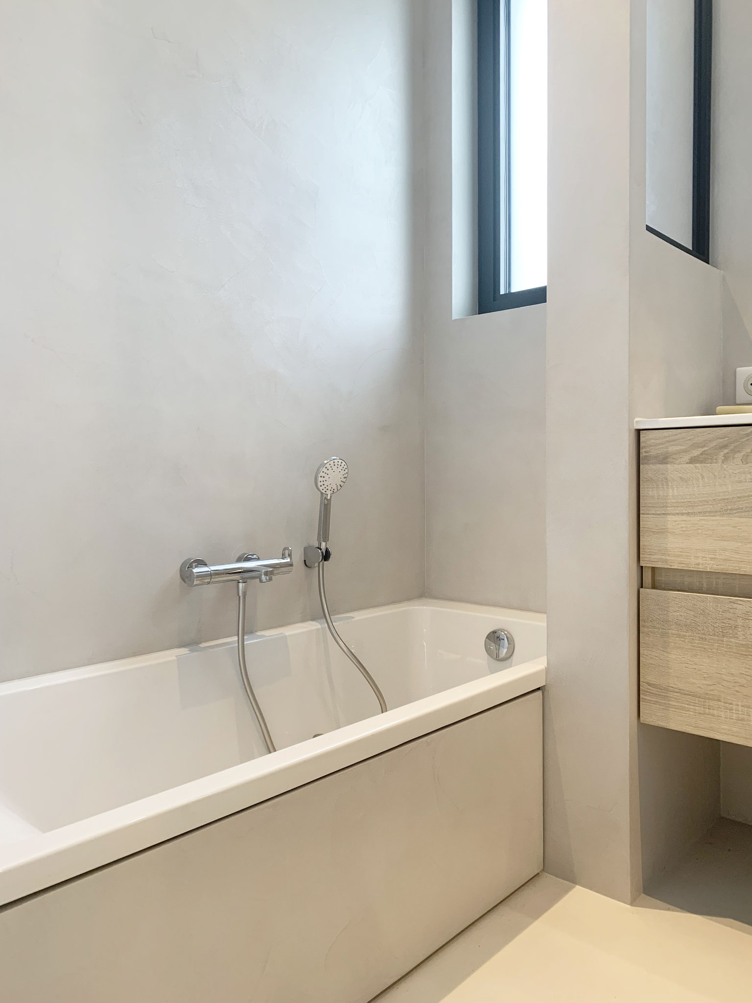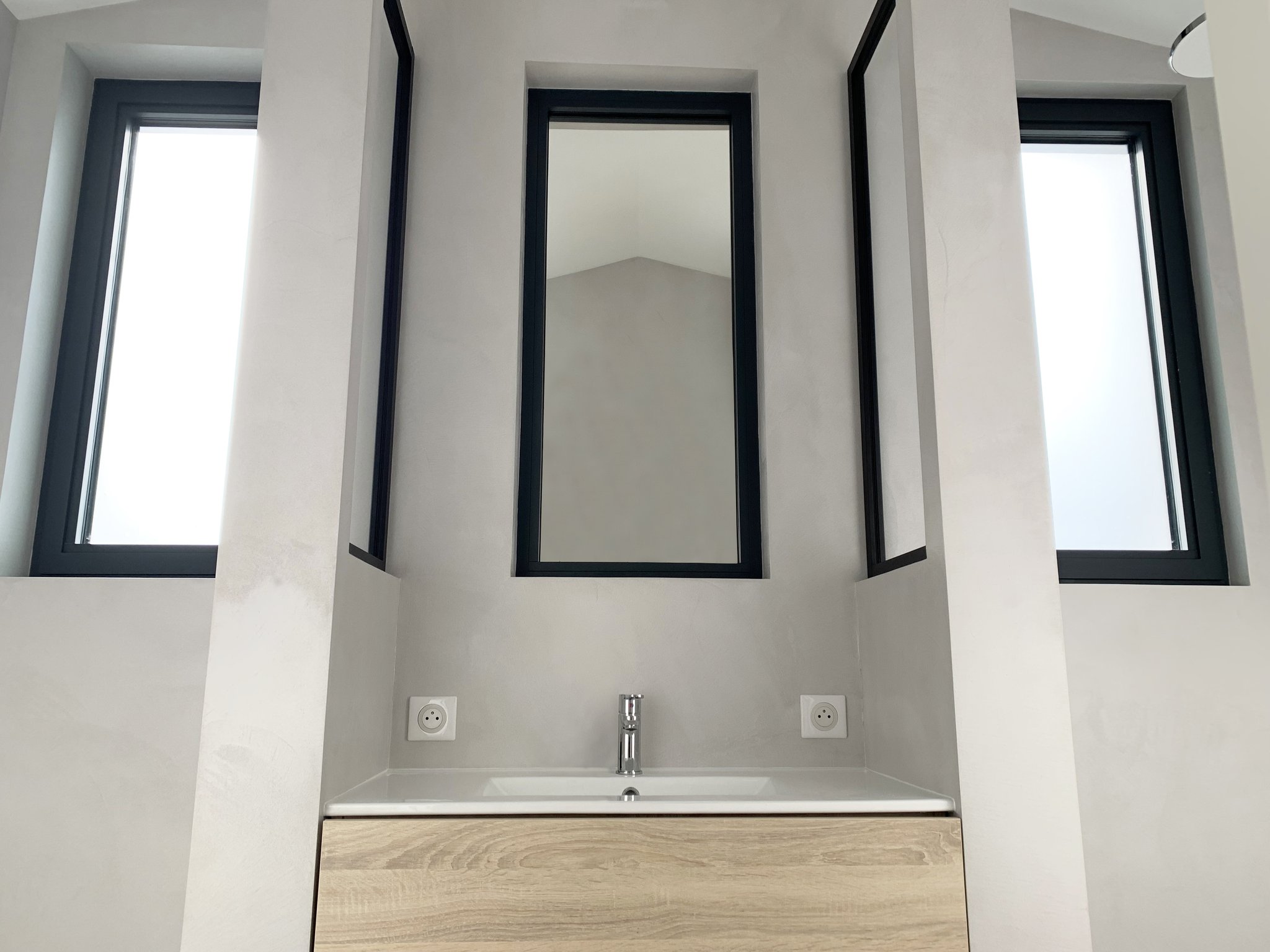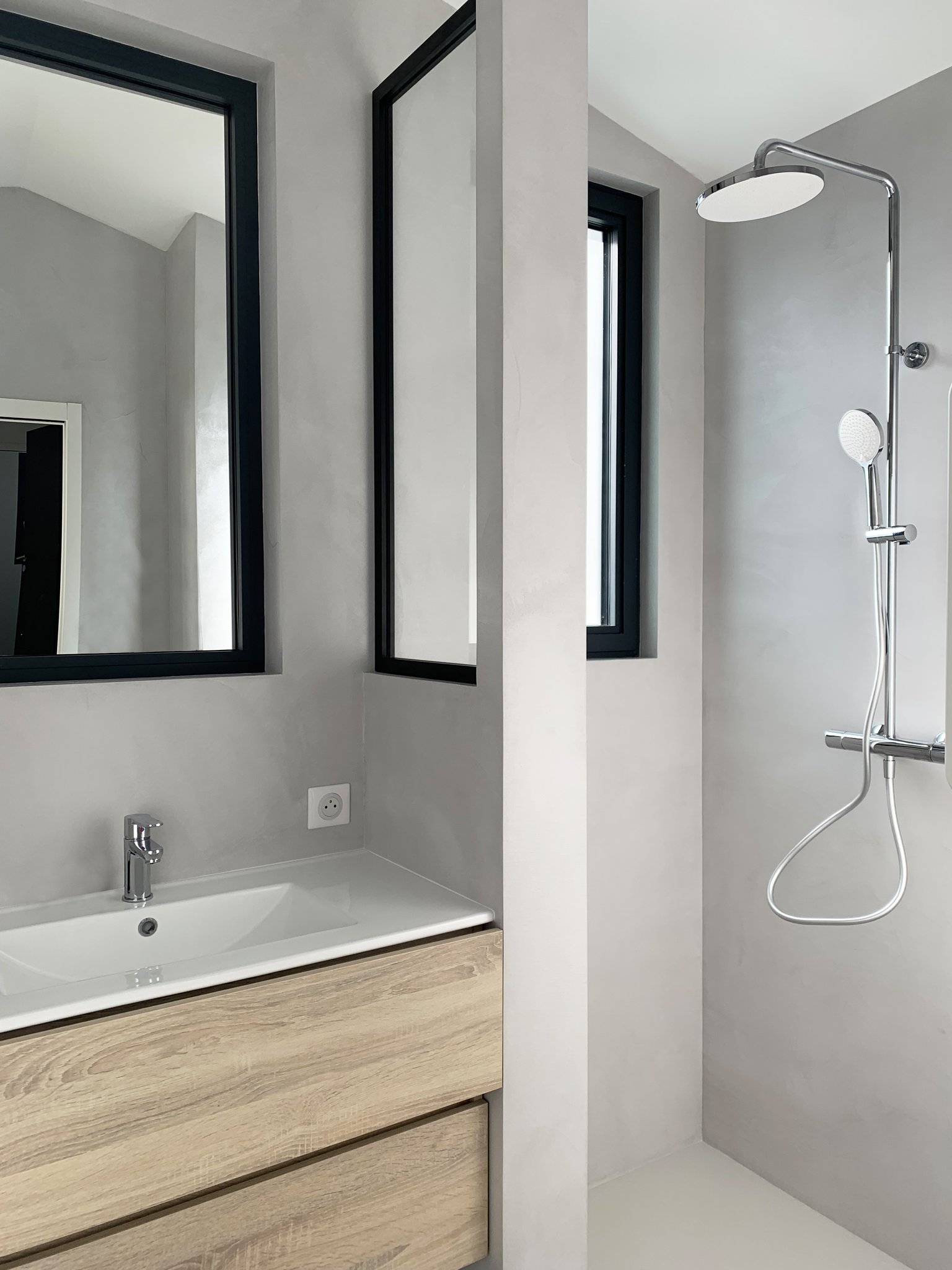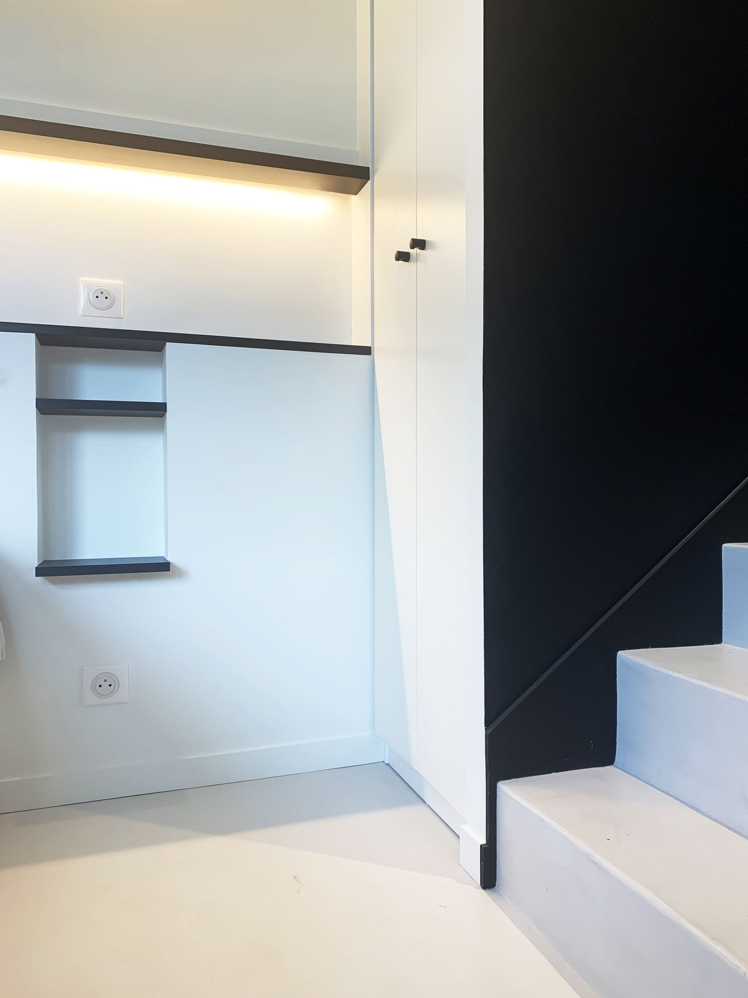 Le rendu minimaliste d'aplats de béton ciré et de peinture surlignés de noir, permettra de personnaliser le lieu via des tableaux et éléments de décoration.