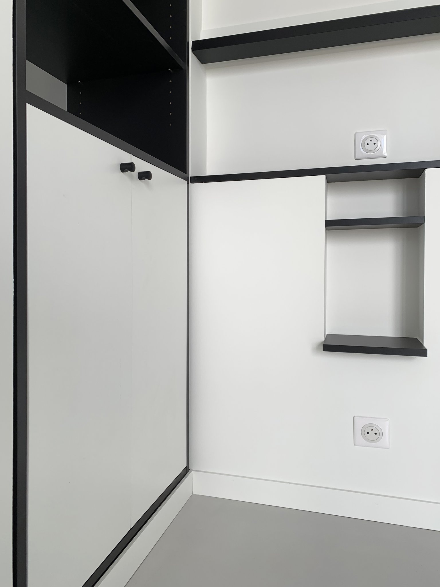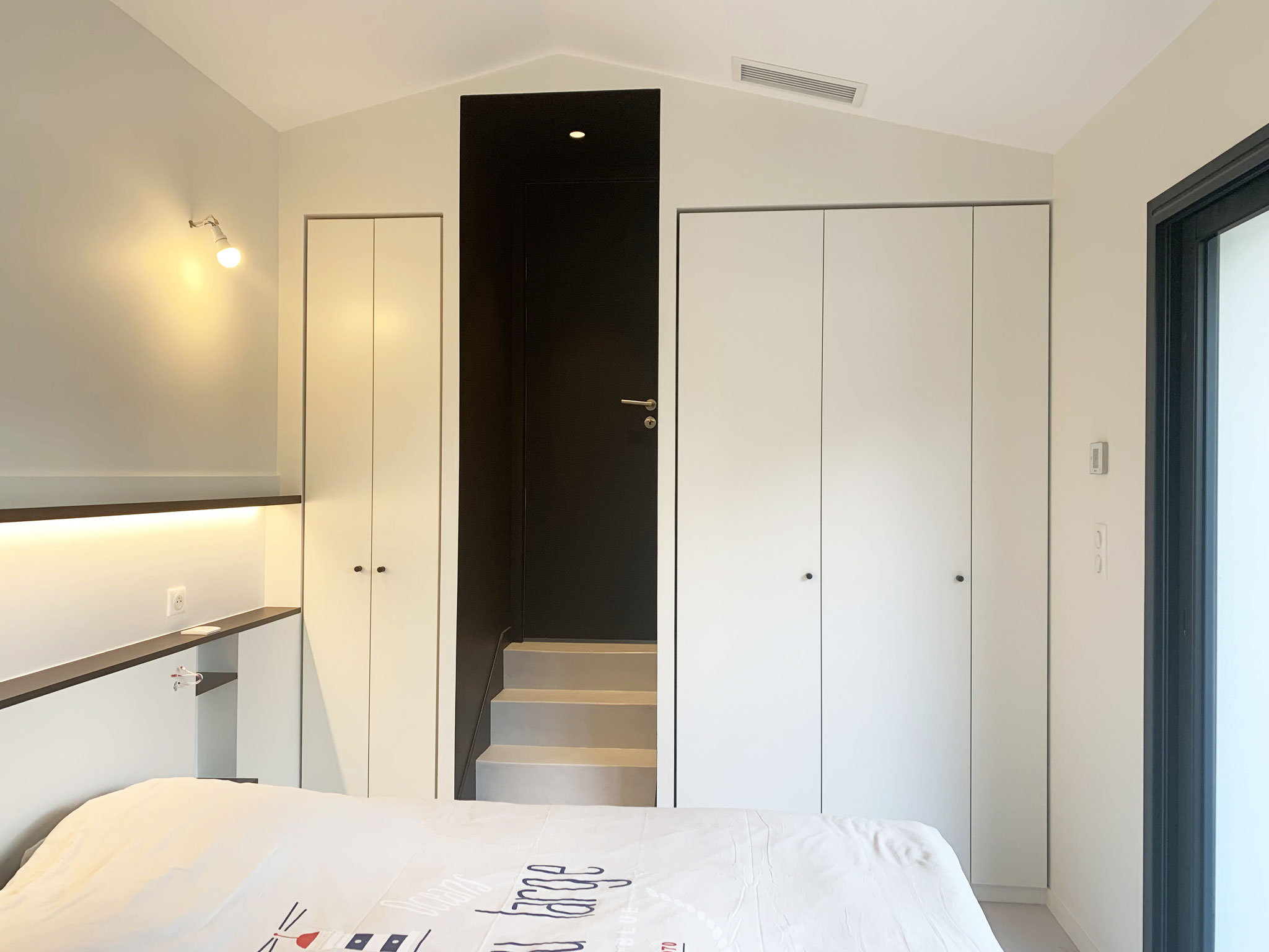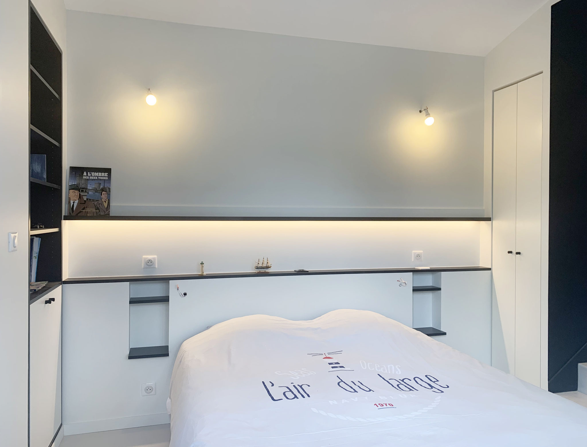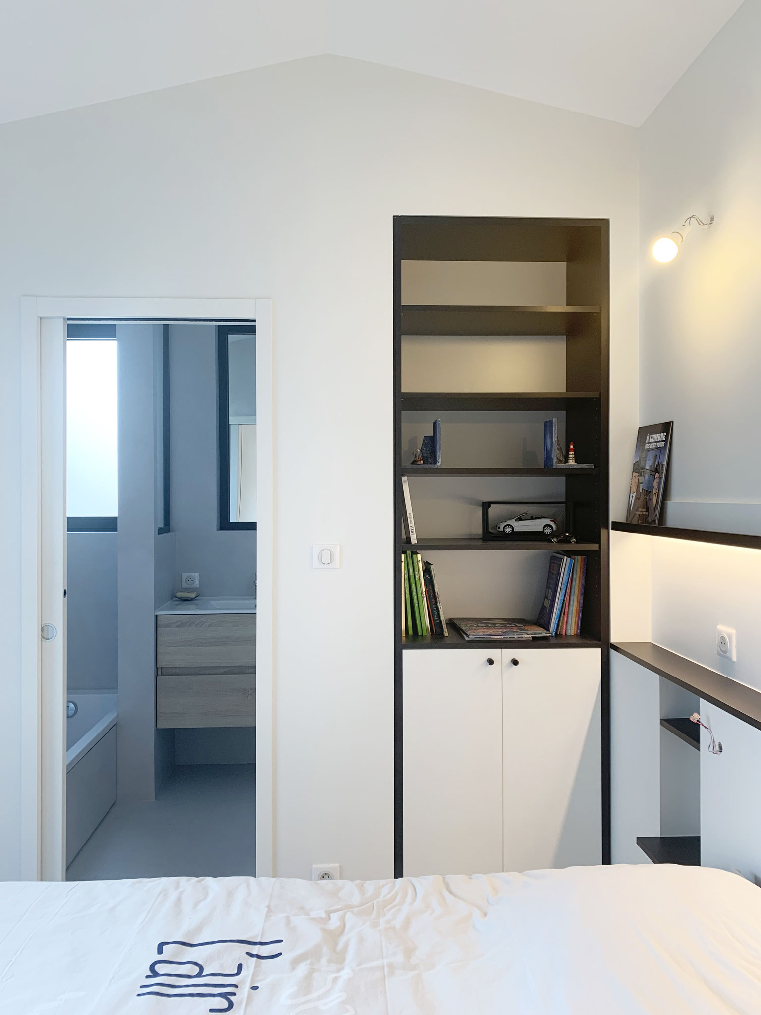 D'une surface de 15m² après isolation, il a fallu imbriquer les volumes et utiliser chaque recoin pour réaliser cette chambre avec dressing, bibliothèque et tête de lit ainsi qu'une salle de bain avec vasque, douche et baignoire.