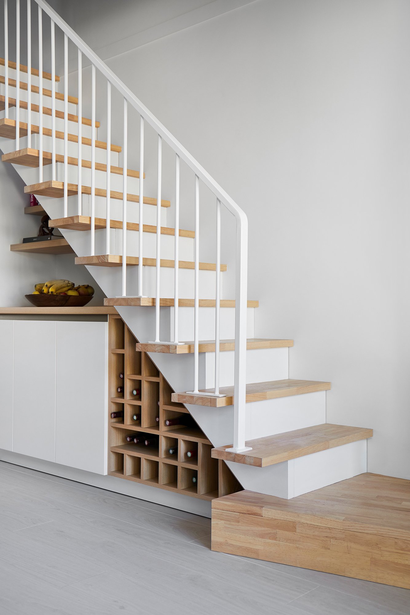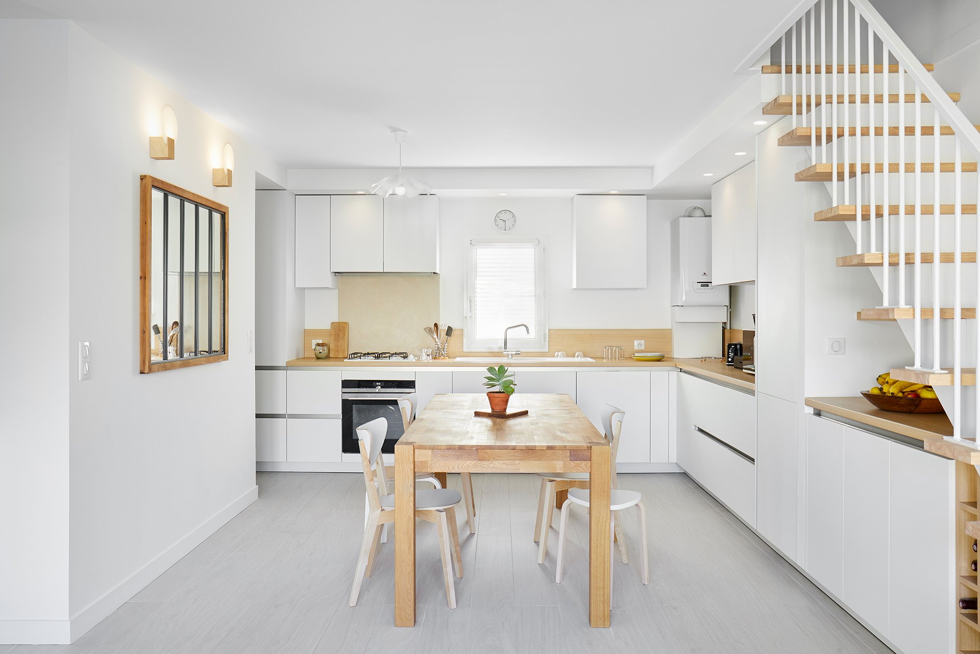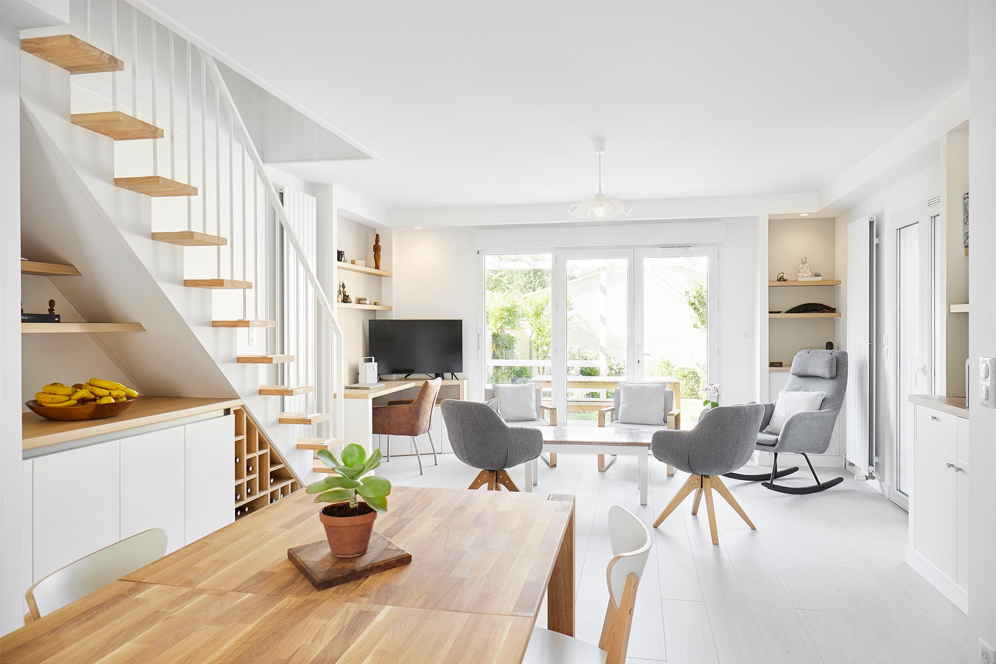 De nombreux rangements et espaces décoratifs ont été créés avec des aménagement sur mesure, et l'escalier volumineux et contraignant a été entièrement redessiné s'intègre désormais à la pièce de vie.