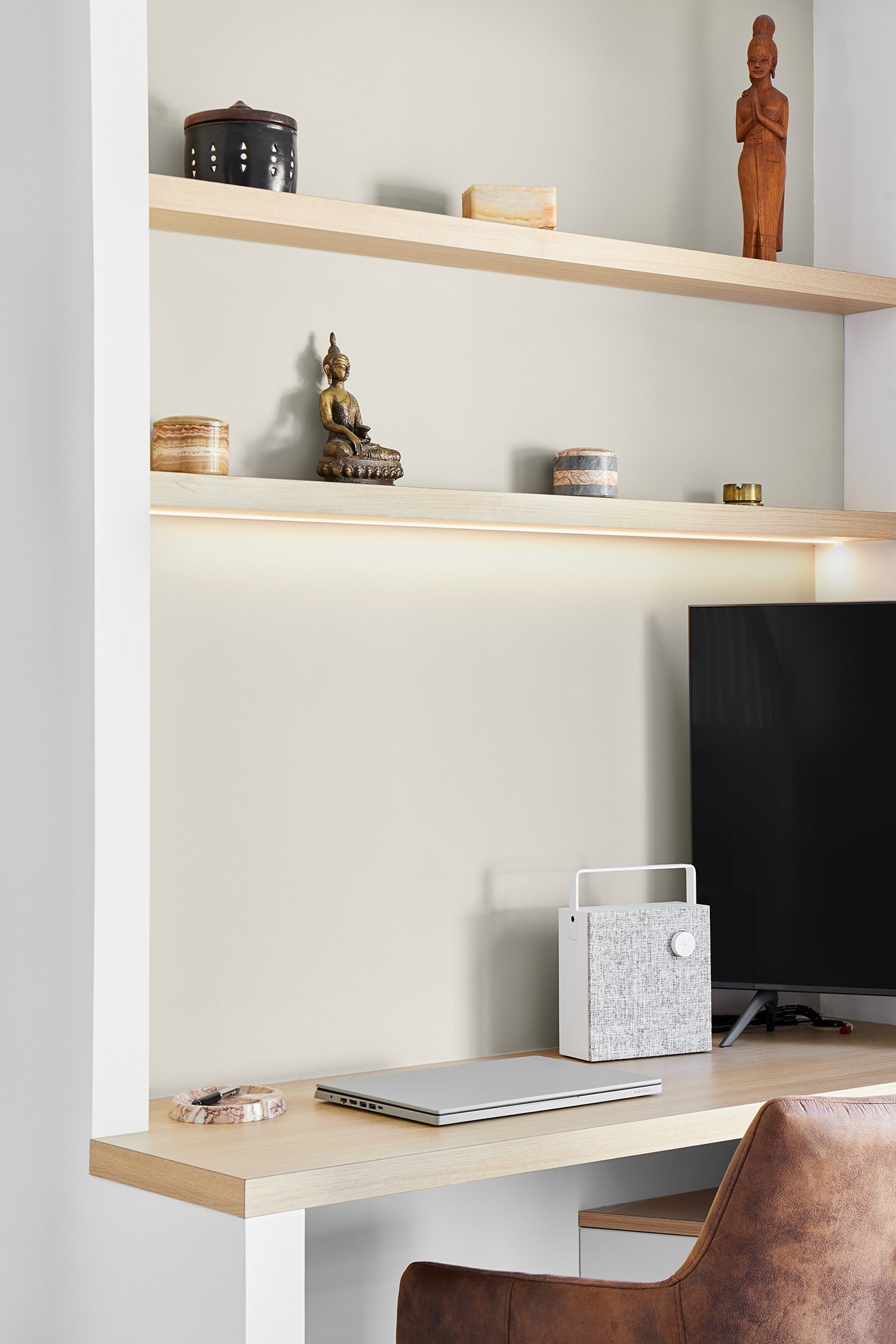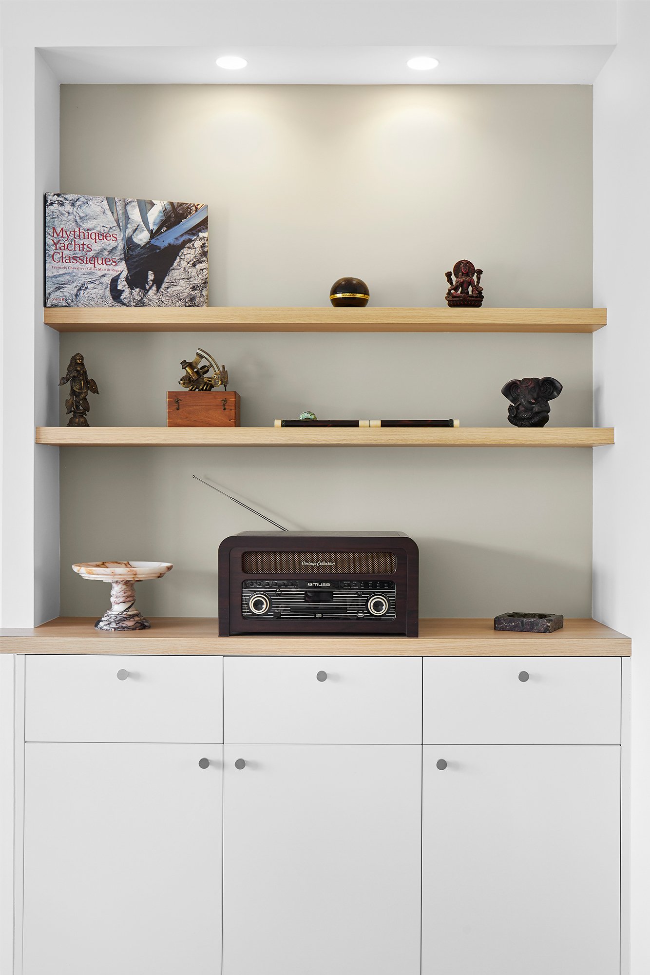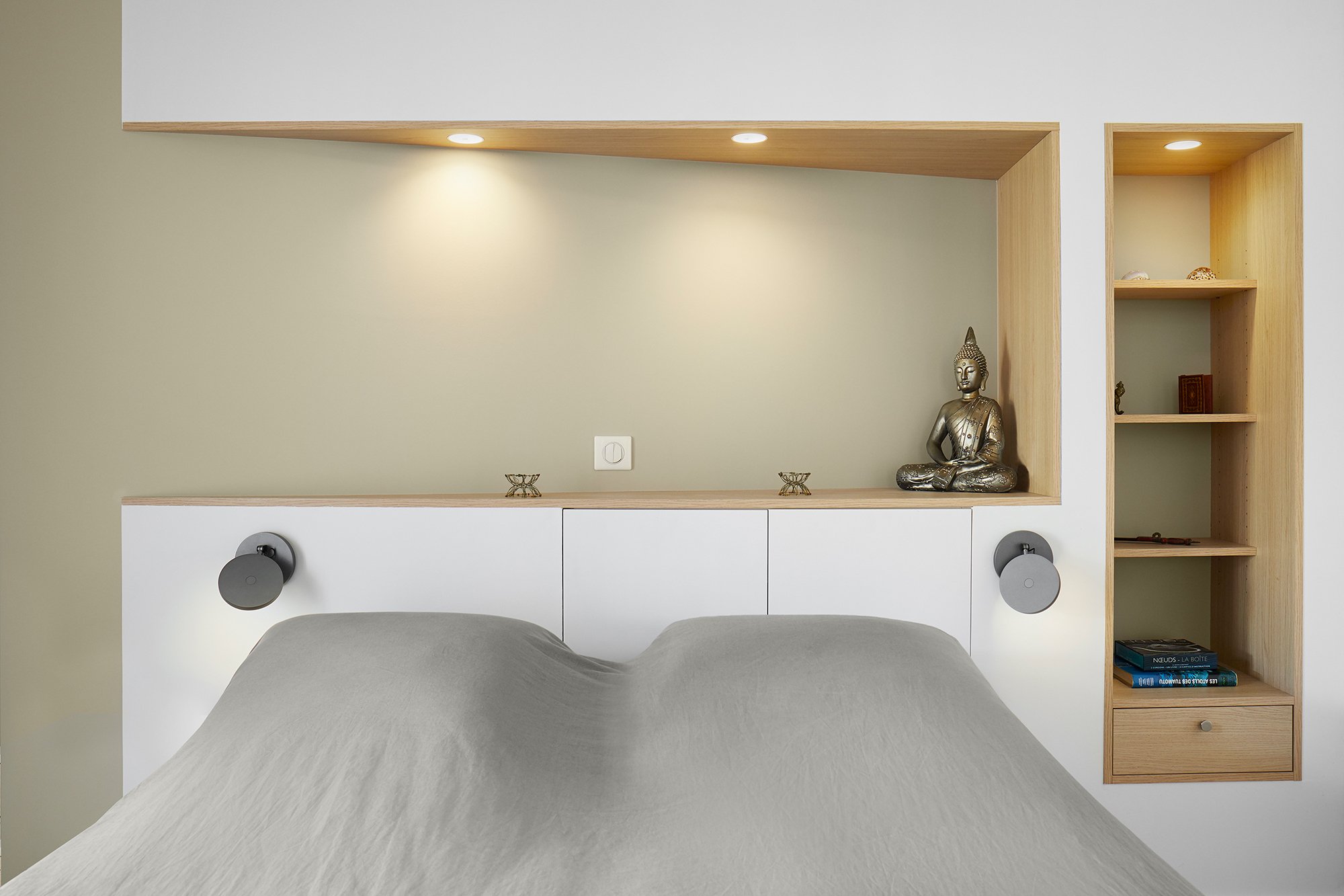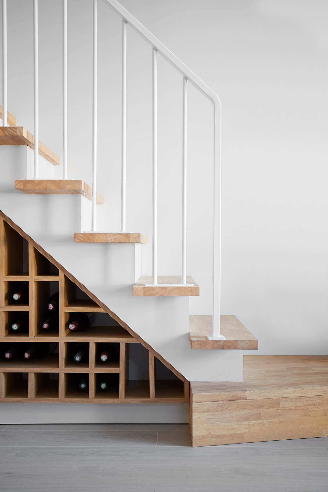 De nombreux rangements et espaces décoratifs ont été créés avec des aménagement sur mesure, et l'escalier volumineux et contraignant a été entièrement redessiné s'intègre désormais à la pièce de vie.