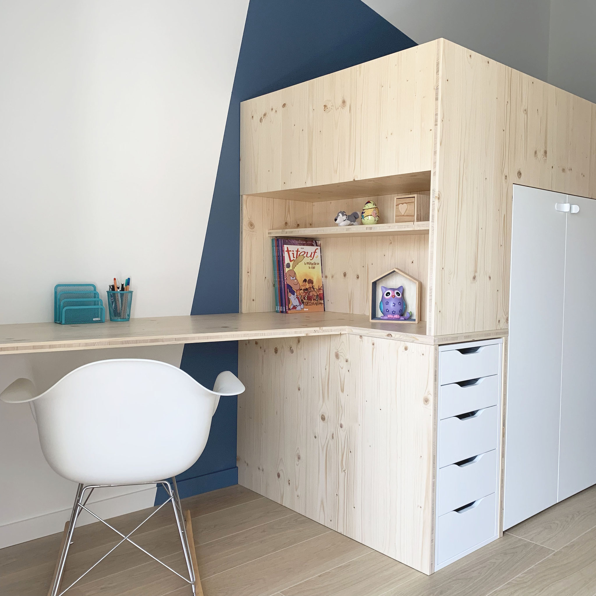 positionnement du lit en hauteur, le dressing, et un plateau de bureau avec sa niche bibliothèque.